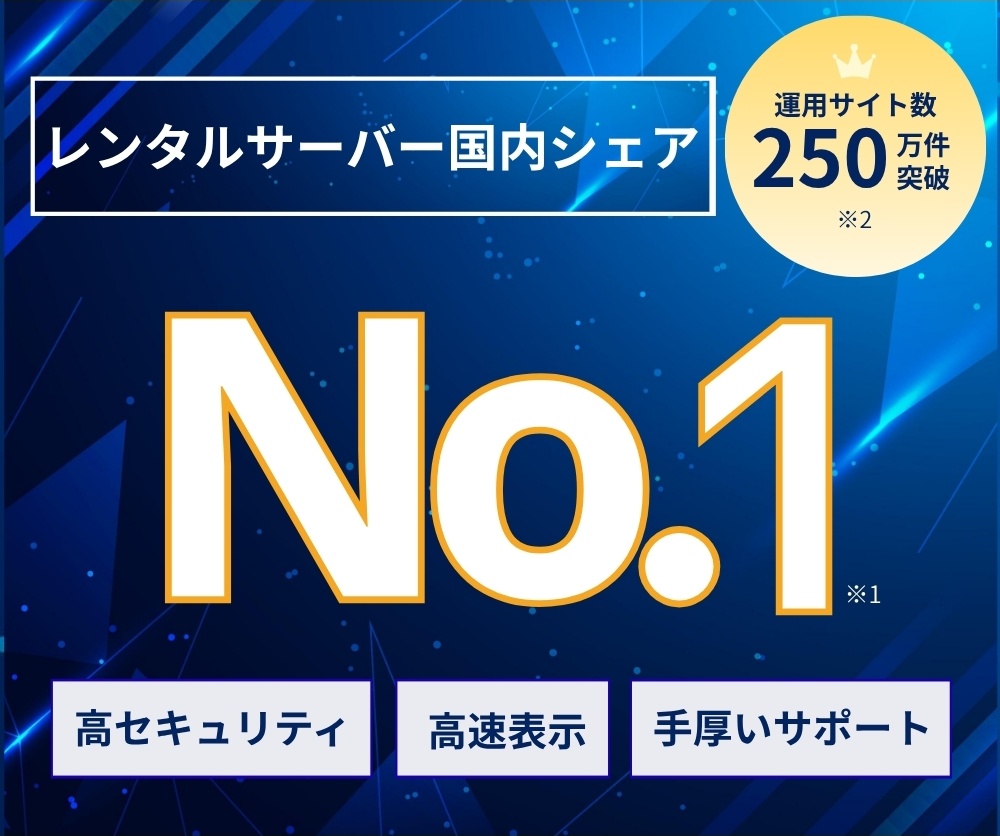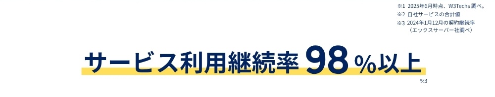 ※2024年12月18日、自社調べ。サーバー速度については、グループ会社サービスを除いた日本国内シェア上位3サービスおよび独自に選定した国内の著名サービス・プランを含め、計6つのサービス・プランを対象に、h2loadを5回計測した結果によるもの。複数プランがあるサービスについては、独自に選定したプランを除き、サービス内の最下位プランで計測した結果によるもの。業界のシェアはW3Techsのデータをもとに算出。※業界のシェアは2025年6月時点、W3Techs 調べ。